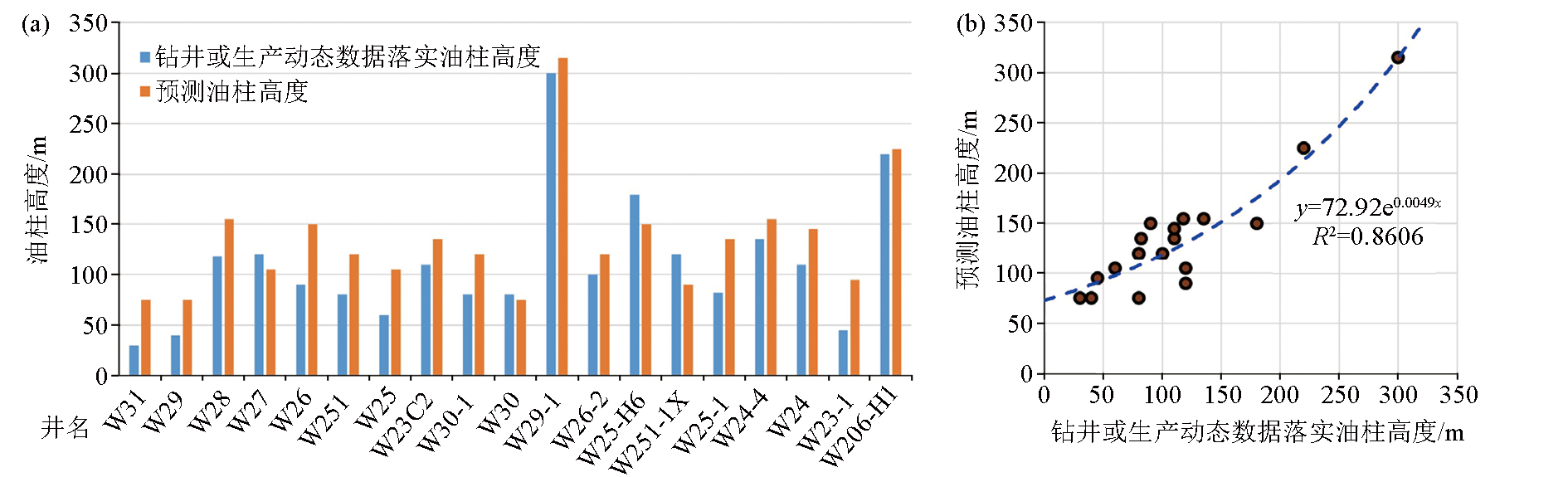 | Fig.7 Comparison between the drilling oil column height in the study area(a) and the predicted oil layer thickness using this method(b) |