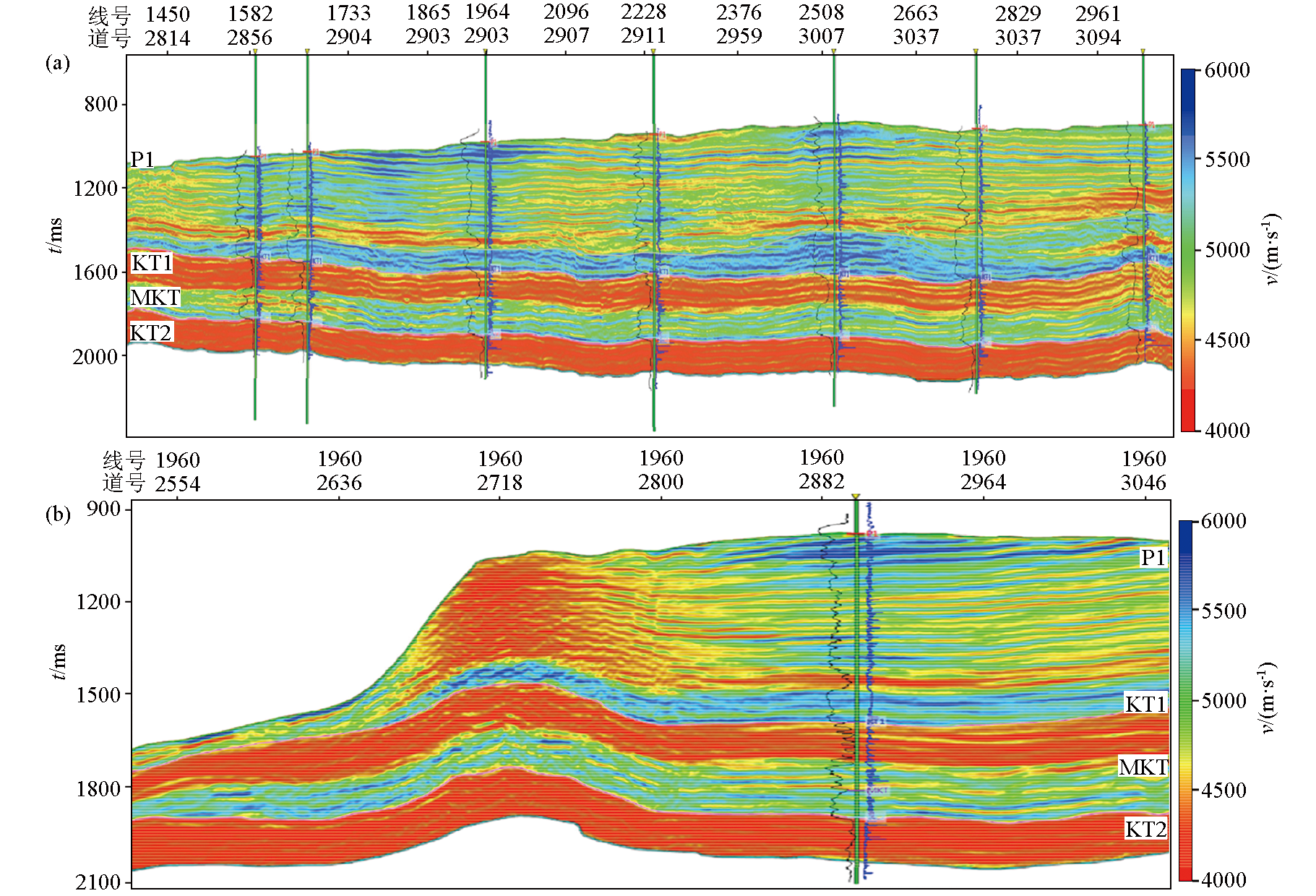 | 图11 研究区不同走向分频反演速度剖面 a—近SN向分频反演结果;b—近EW向分频反演结果 |