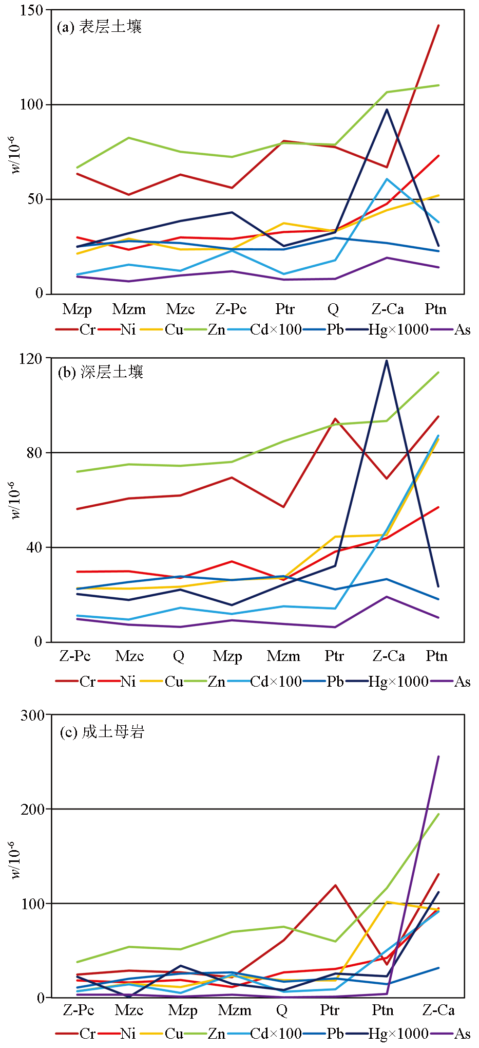 | Fig.3 Distribution characteristics of heavy metals in surface soil, deep soil and forming soil matrix Q—Quaternary system;Mzc—Mesozoic clastic rock;Mzm—Mesozoic acid rock; Mzp—Mesozoic pyroclastic rock;Z-Pc—Sinian-Permian carbonate rocks;Z-Ca—Sinian-Carboniferous argillaceous clastic rock; Ptn—Precambrian base rock; Ptr—Precambrian metamorphic rock |