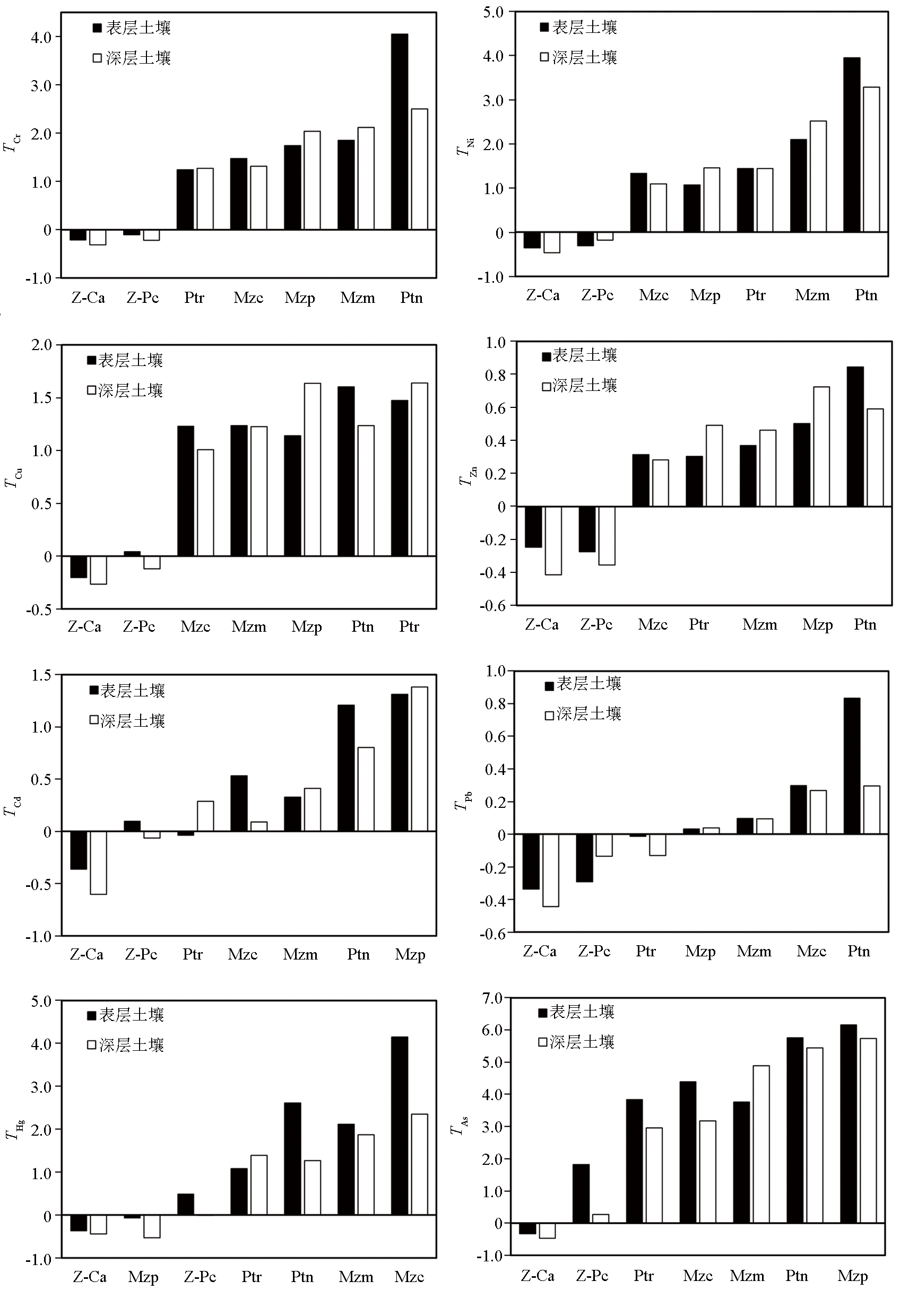 | 图5 表层、深层土壤重金属元素迁移系数 Mzc—中生代碎屑岩;Mzm—中生代中酸性岩;Mzp—中生代火山碎屑岩;Z-Pc—震旦纪-二叠纪碳酸盐岩;Z-Ca—震旦纪-石炭纪泥质碎屑岩;Ptn—前寒武纪基性岩;Ptr—前寒武纪变质岩 |