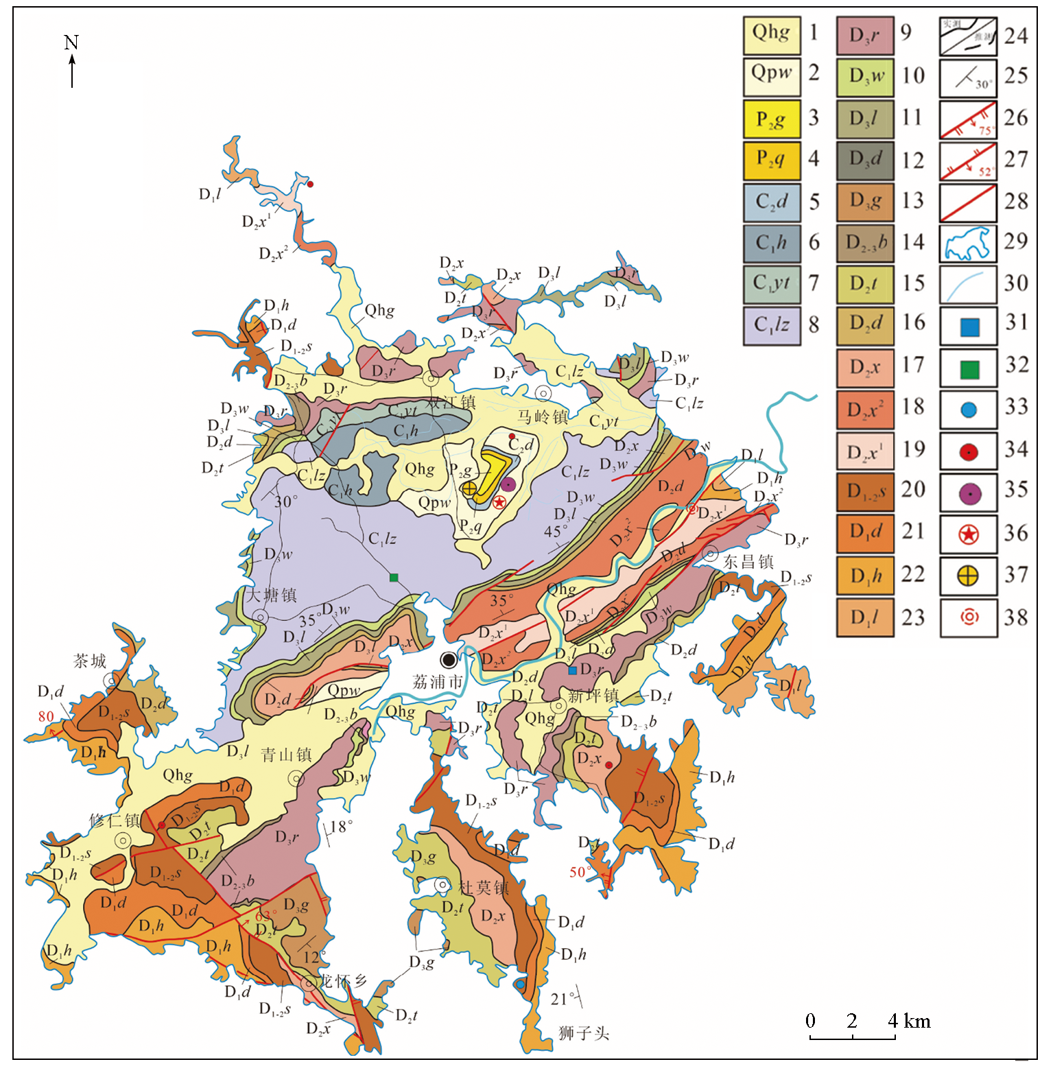 | 图1 研究区地质图(根据文献[ 1—桂平组;2—望高组;3—孤峰组;4—栖霞组;5—大埔组;6—黄金组;7—英塘组;8—鹿寨组;9—融县组;10—五指山组;11—榴江组;12—东村组;13—桂林组;14—巴漆组;15—唐家湾组;16—东岗岭组;17—信都组;18—信都组上段;19—信都组下段;20—四排组;21—大乐组;22—贺县组;23—莲花山组;24—整合岩层界线;25—岩层产状;26—实测正断层;27—实测逆断层;28—区域性断层;29—工作区;30—河流;31—石灰岩矿(床)点;32—黏土矿(床)点;33—铅矿(床)点;34—铁矿(床)点;35—锰矿(床)点;36—多金属矿(床)点;37—金矿(床)点;38—硅化 |