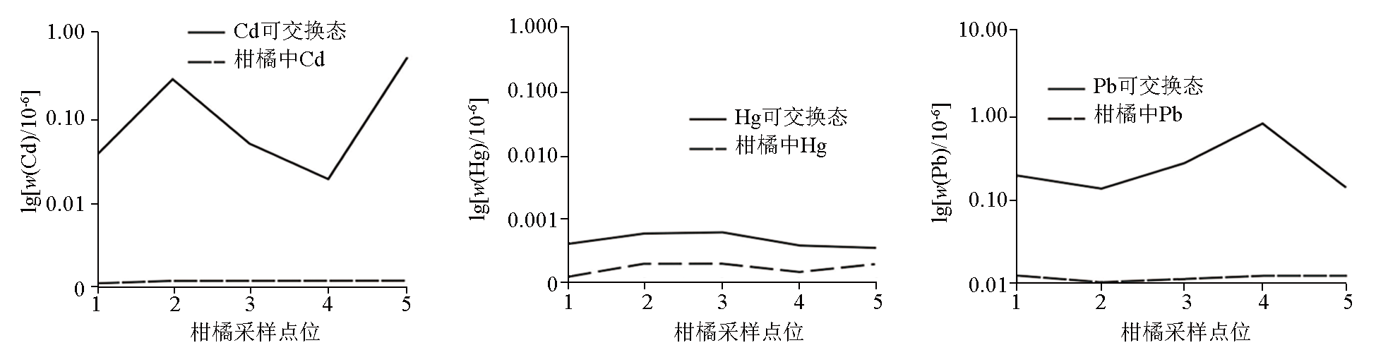 | 图6 Cd、Hg、Pb可交换态含量与柑橘Cd、Hg、Pb含量对数对比 |