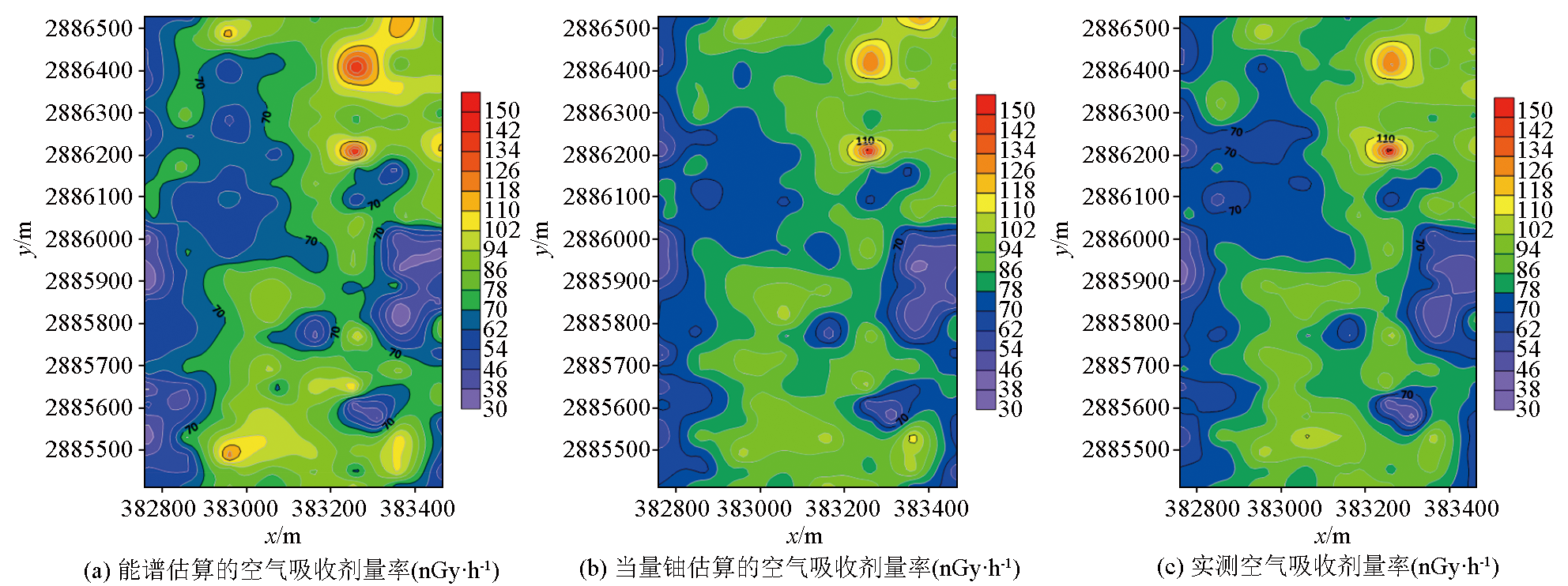 | 图3 能谱、当量铀估算的空气吸收剂量率与实测空气吸收剂量率等值线 |