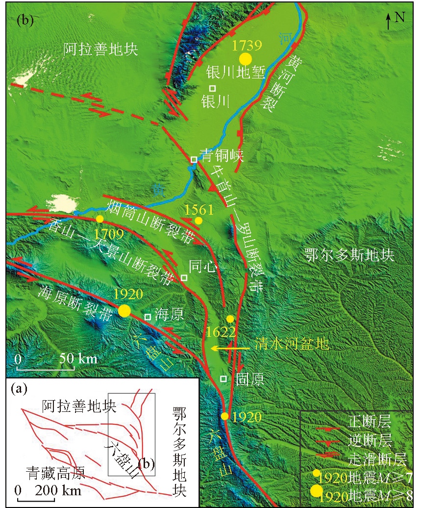 | 图1 六盘山及清水河盆地大地构造背景 a—六盘山大地构造位置;b—六盘山及邻区断裂体系 |
