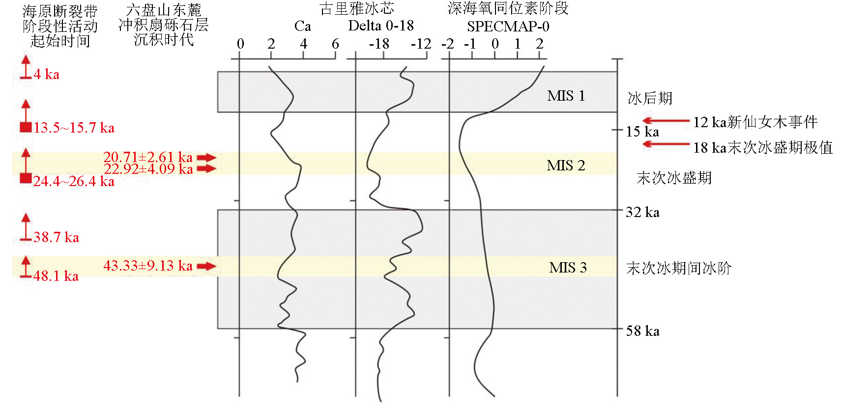 | 图7 六盘山东麓冲积扇晚更新世末以来活动性与断裂带构造活动、气候变化序列对比关系 (海原断裂带晚更新世末活动性据Zhang et al.[ |