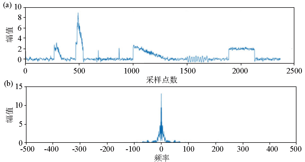 | 图5 加噪后实测信号的时间序列(a)和加噪后实测信号频谱(b) |