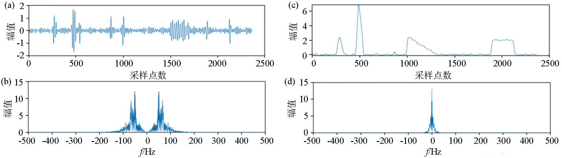 | 图6 K=2时对测试信号VMD分解时间序列和频谱 a—IMF1时间序列; b—IMF1频谱;c—IMF2时间序列; d—IMF2频谱 |