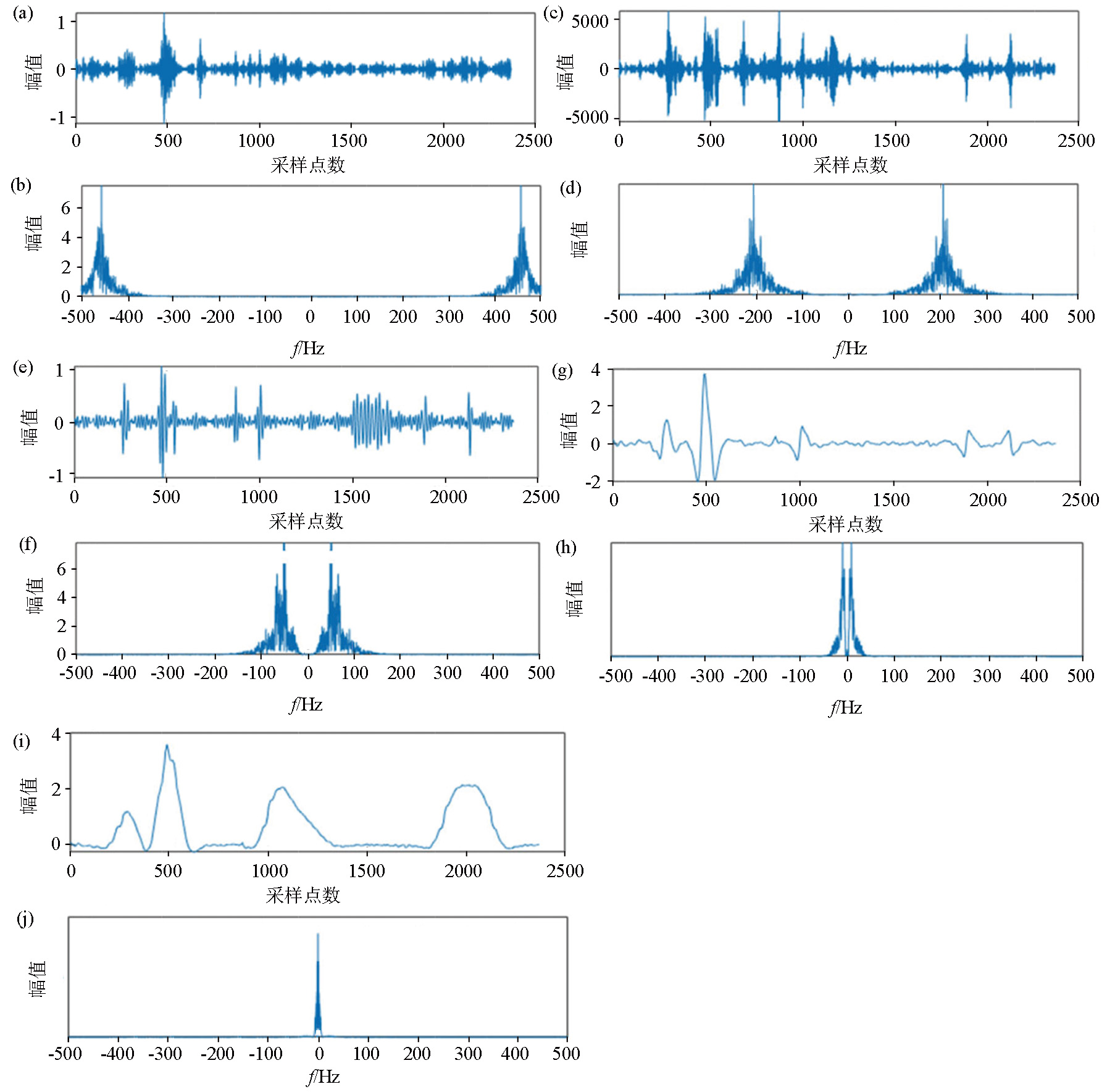 | 图9 K=5时对测试信号VMD分解时间序列和频谱 a—IMF1时间序列; b—IMF1频谱;c—IMF2时间序列; d—IMF2频谱;e—IMF3时间序列; f—IMF3频谱;g—IMF4时间序列; h—IMF4频谱;i—IMF5时间序列; j—IMF5频谱 |