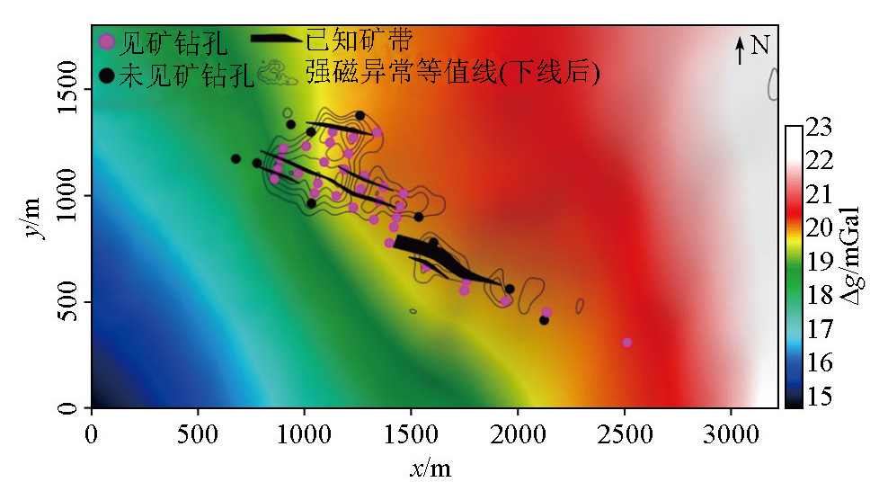 | Fig.12 1∶10 000 Bouguer gravity anomaly in the study area covered by the downward continued magnetic anomalies with high values |