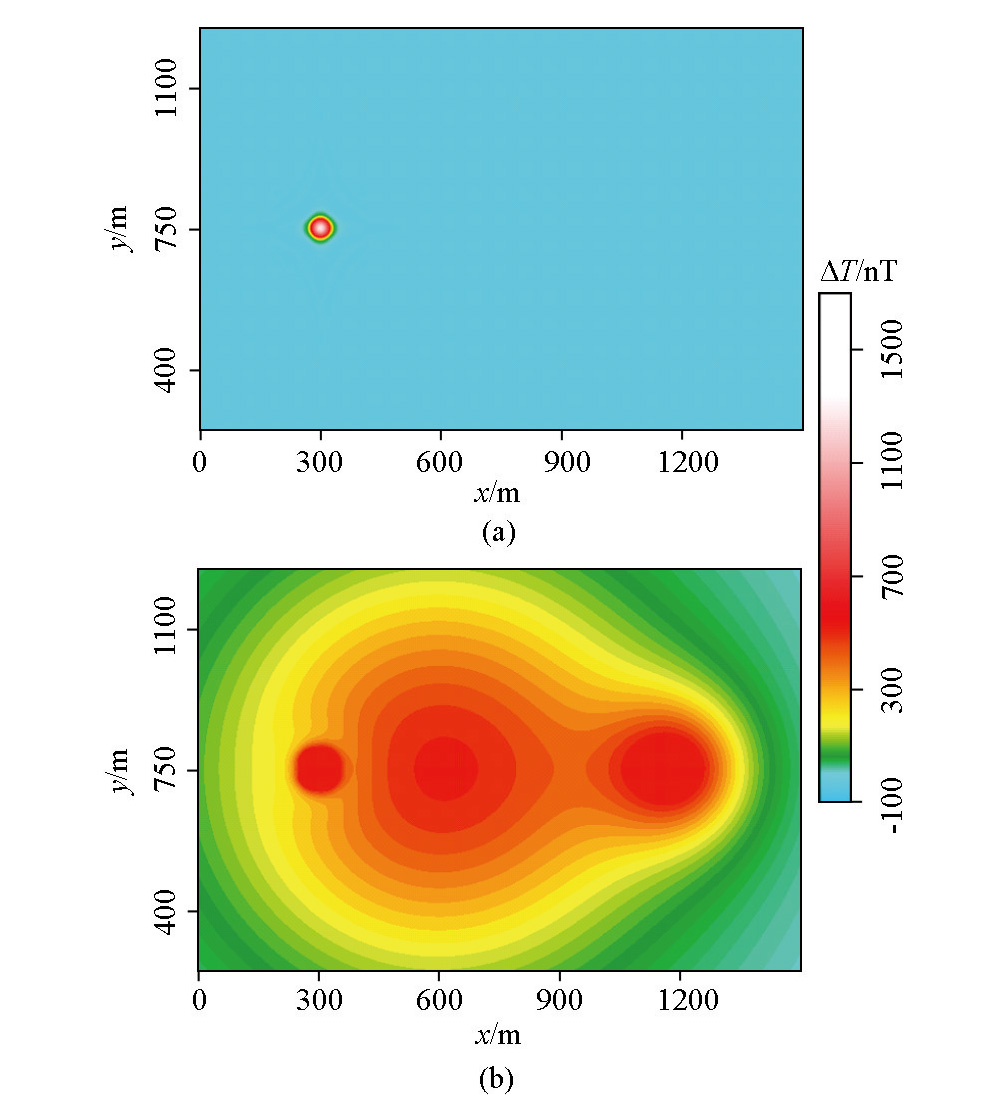 | 图2 采用λ0=0.057 6的低秩矩阵分解得到的局部磁异常(a)和区域磁异常(b),其中(a)表示从叠加场中分离得到的A异常 |