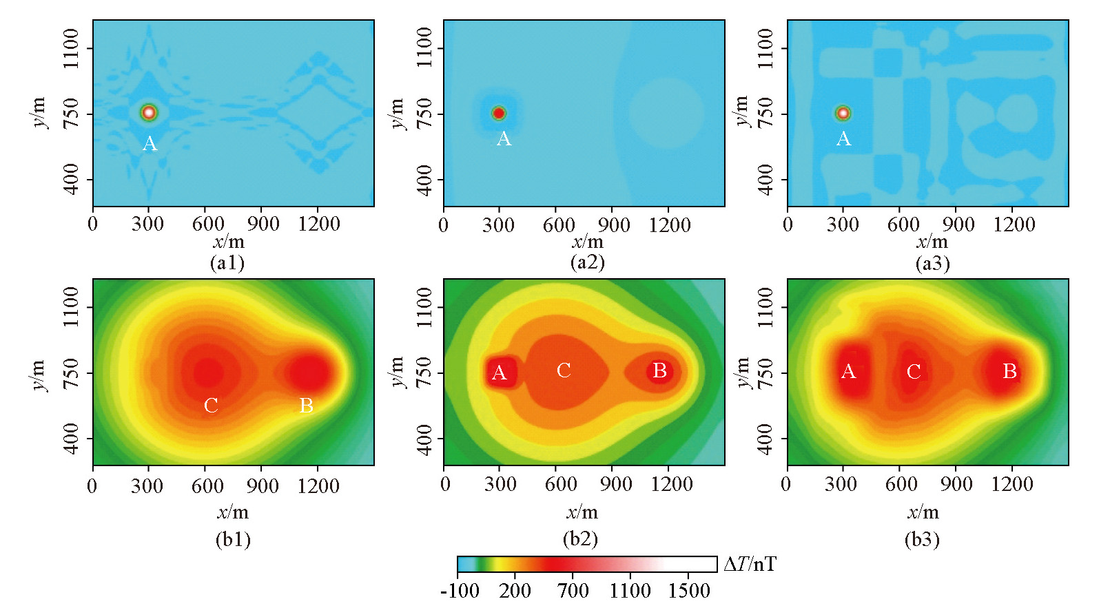 | 图4 不同方法将A异常与叠加场分离得到的局部磁异常(a1~a3)和区域磁异常(b1~b3) (a1、b1—是本文方法采用λ=0.022 5得到的结果;a2、b2—是滑动窗口平均采用窗口大小为31×31时得到的结果;a3、b3—是小波多尺度分析采用5阶小波细节得到的结果) |