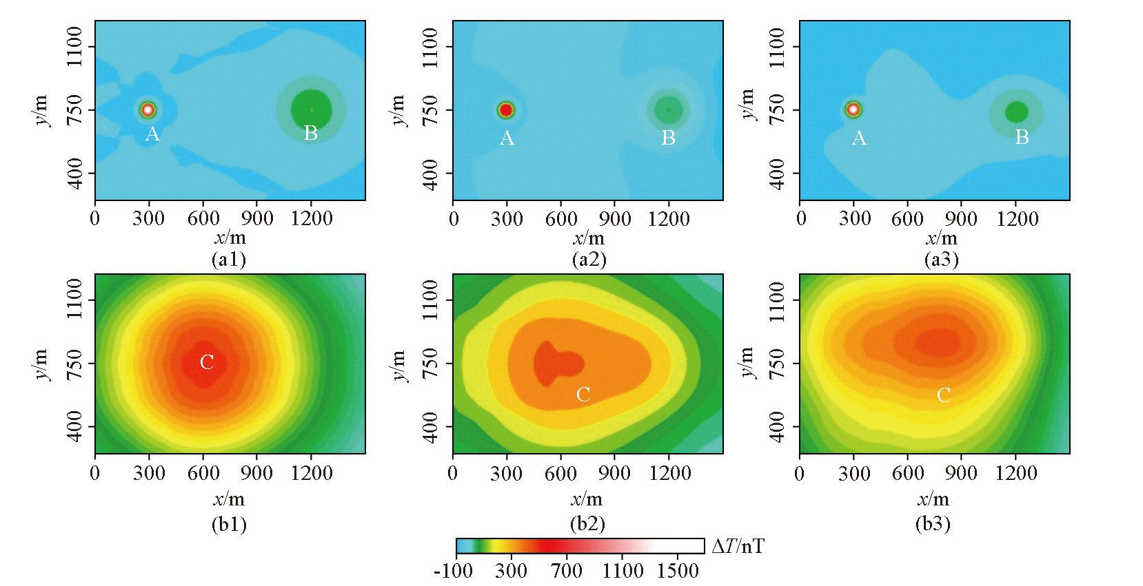 | 图5 不同方法将A、B异常与叠加场分离得到的局部磁异常(a1~a3)和区域磁异常(b1~b3) (a1、b1—是本文方法采用λ=0.0 063得到的结果;a2、b2—是滑动窗口平均采用窗口大小为101×101时得到的结果;a3、b3—是小波多尺度分析采用7阶小波细节得到的结果) |