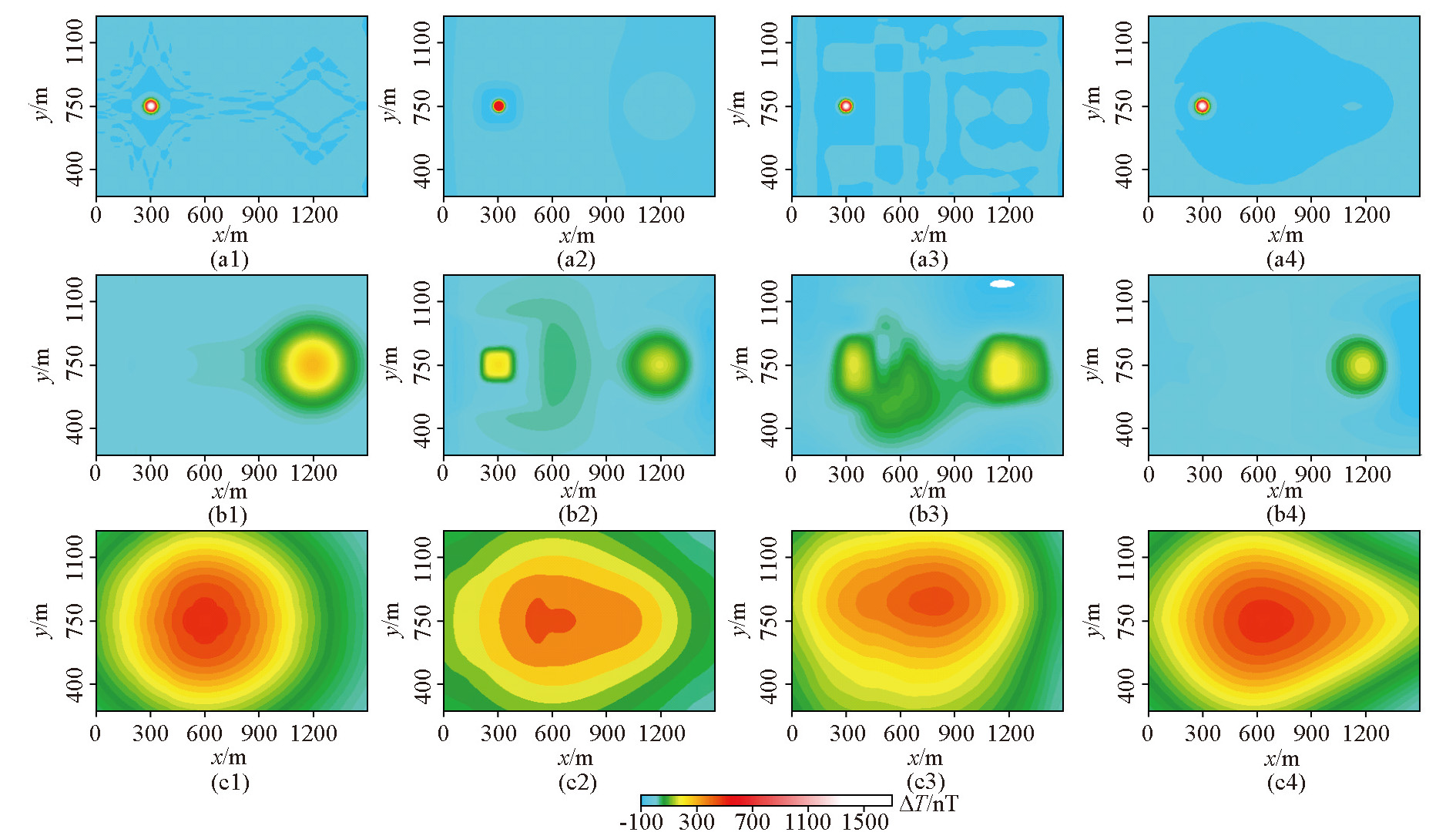 | 图6 不同方法对A、B、C这3个磁异常的分离结果(a1、b1、c1—是本文方法得到的分离结果;a2、b2、c2—是滑动窗口平均得到的分离结果;a3、b3、c3—是小波多尺度分解得到的分离结果;a4、b4、c4—是采用Zhu等[ |