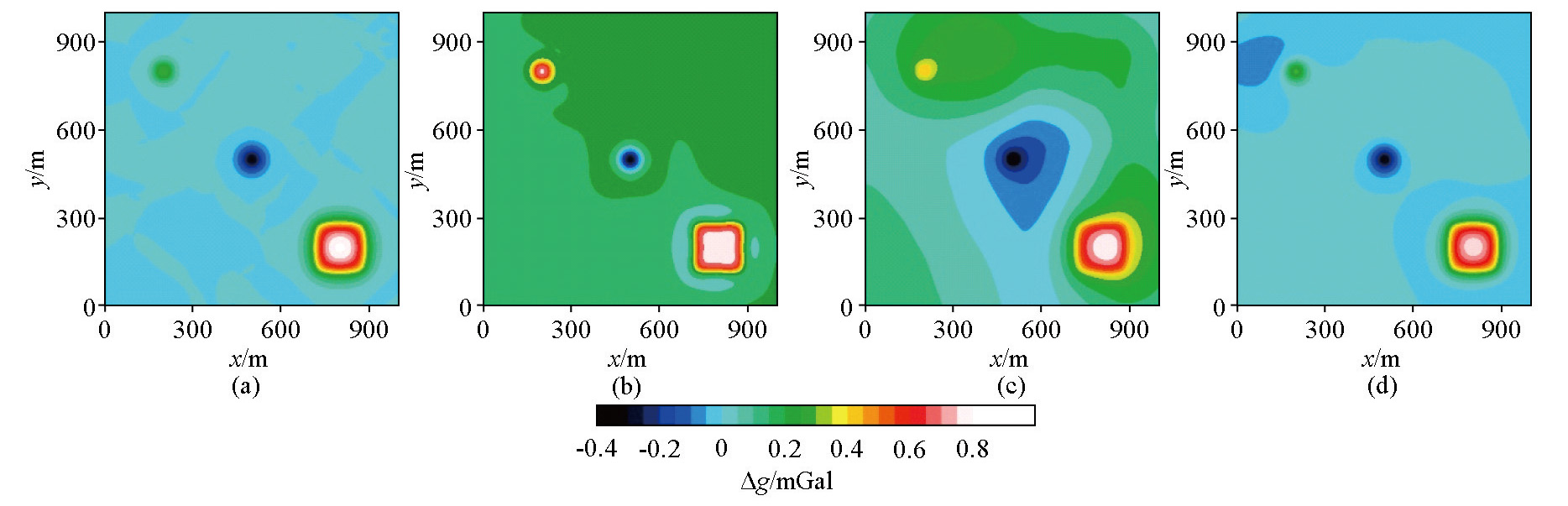 | Fig.9 The separated residual gravity anomalies (a—the proposed method; b—the sliding window average method; c—the wavelet analysis method; d—the method shown in Zhu et al[ |