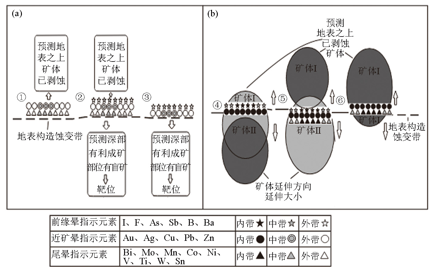 | Fig.2 The practical ideal model of structural superimposed halo for predicting the deep blind ore in the mining area and the peripheral surface structural alteration zone (a) and judging the extension size of the mineralized body (b) in the hydrothermal deposit |