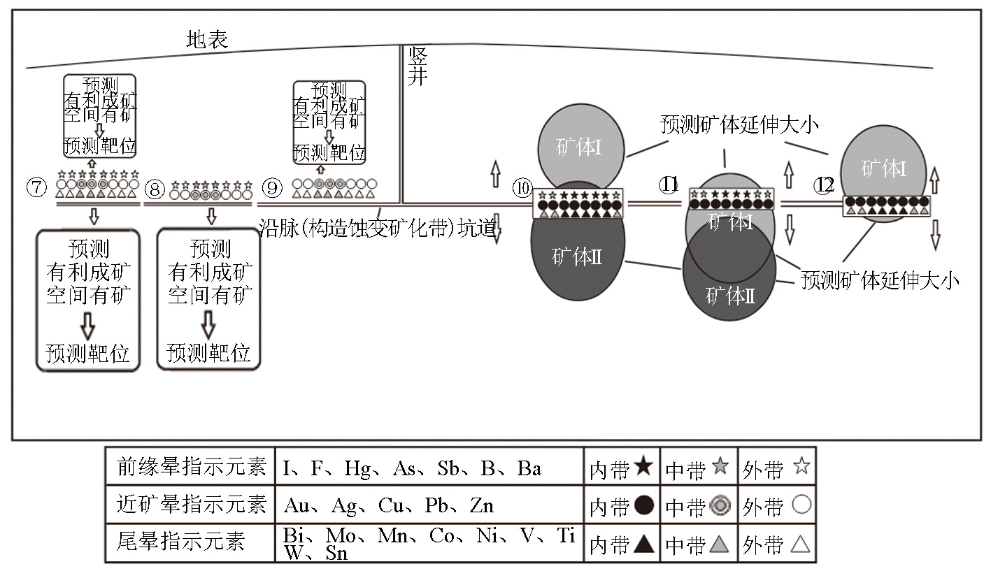 | 图3 热液矿床预测矿区及外围坑道内构造蚀变带上一下盲矿和判别矿体延伸方向与大小的构造叠加晕实用理想模型垂直纵投影 |