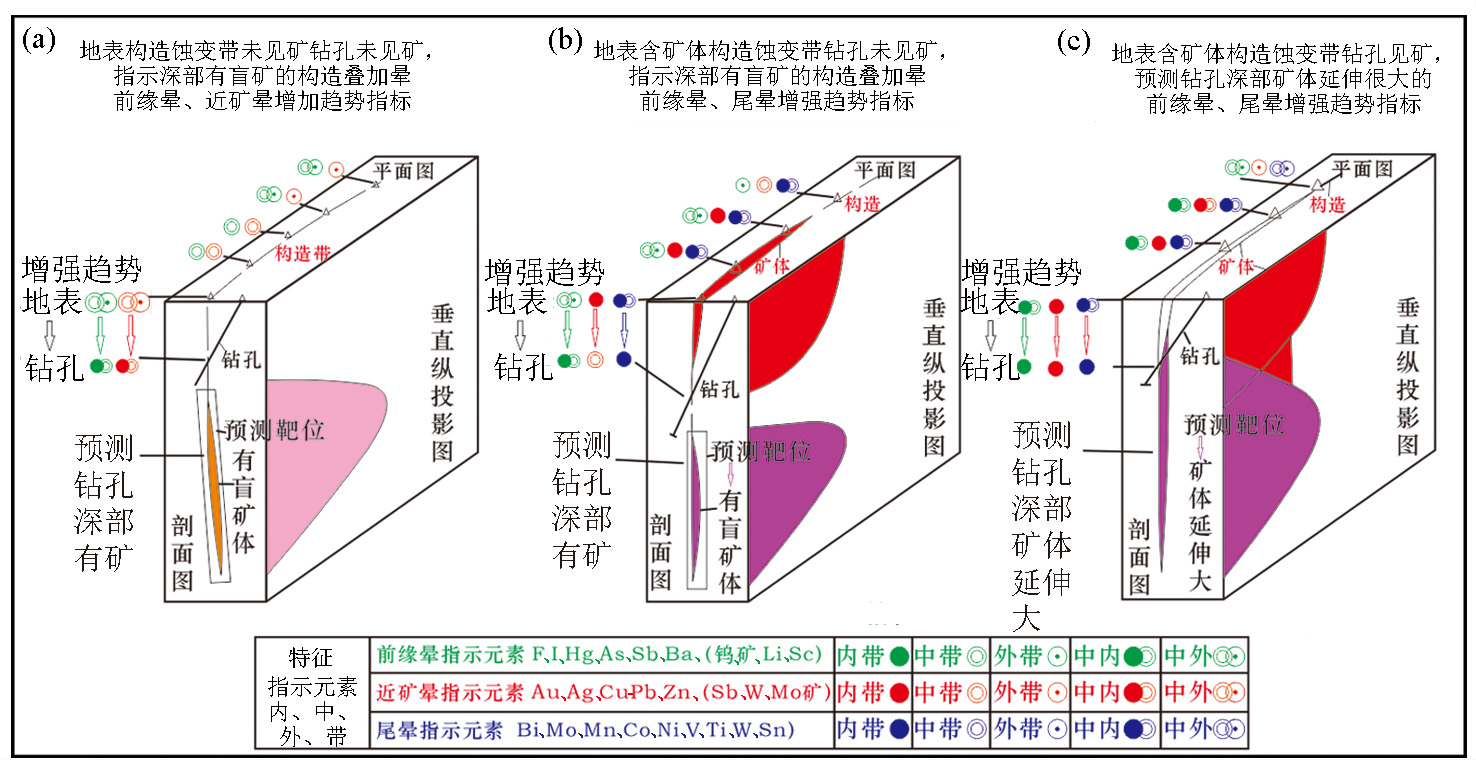 | 图4 热液矿区及外围地表构造或矿体露头有一孔控制剖面深部预测的构造叠加晕实用模型 |