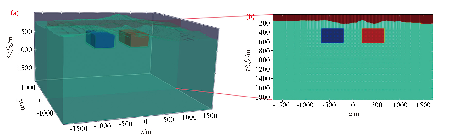 | 图10 正演模型 a—三维模型;b—模型切片(其中上方红色区域代表空气地形,蓝色块为低阻体,红色块为高阻体,图中点代表网格中心分布位置) |