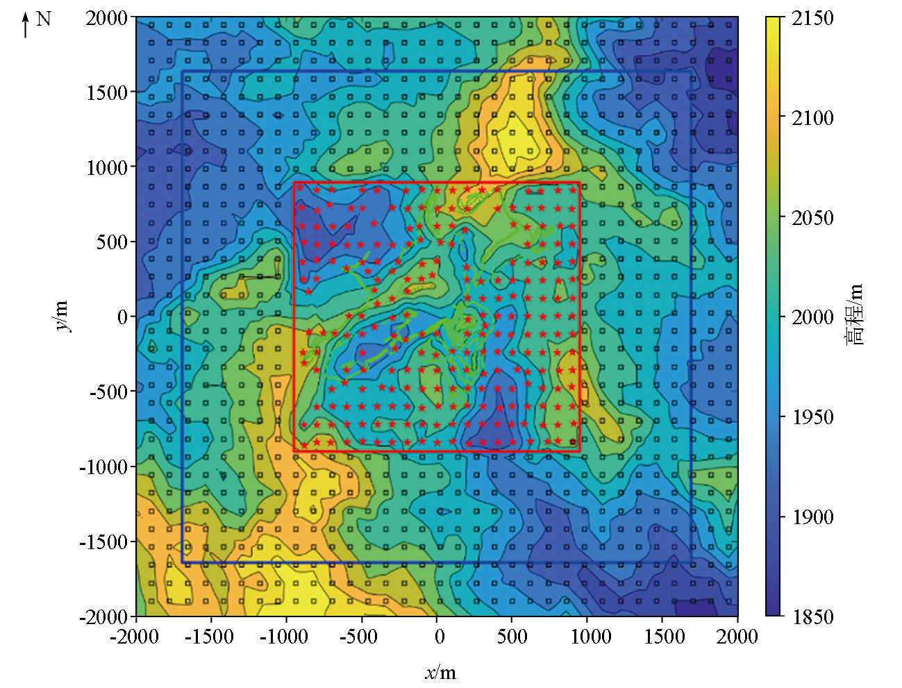 | 图2 高程数据来源位置分布(红色星状点代表音频大地电磁GPS测点,绿色圆点代表路线上的GPS高程数据,黑色方形点代表ASTER GDEM V2的DEM数据,红色框代表研究区域,蓝色框代表扩展网格区域) |