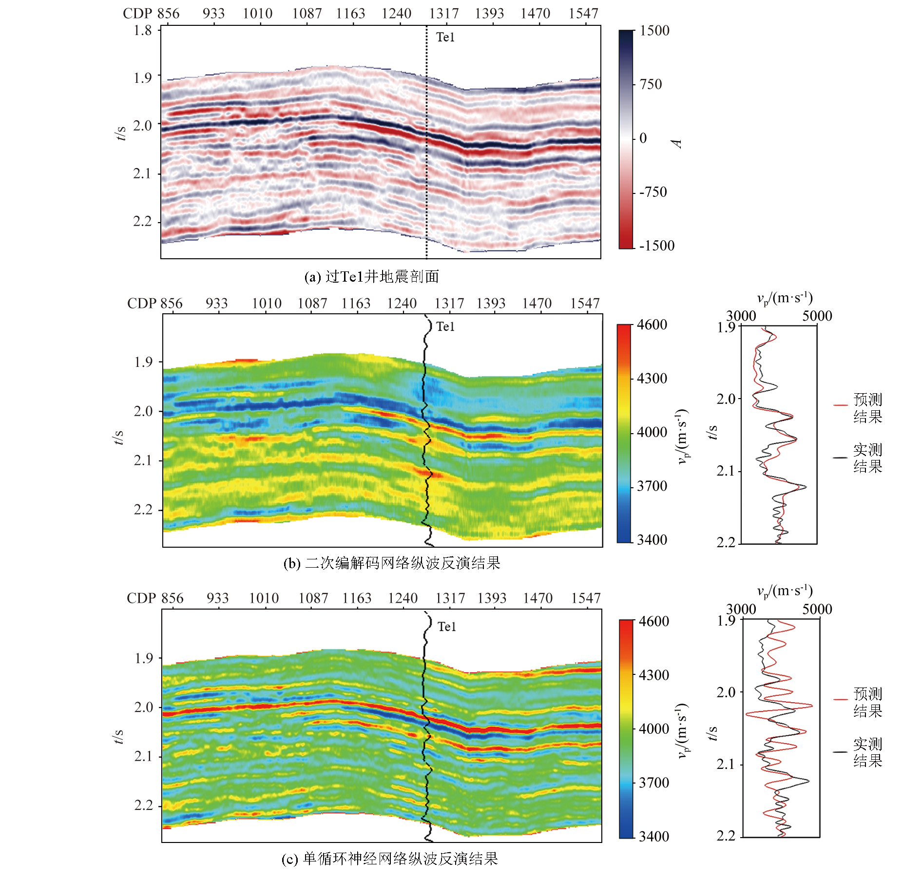 | 图5 过Te1井二次编解码网络与循环神经网络预测剖面及Te1井预测曲线 |