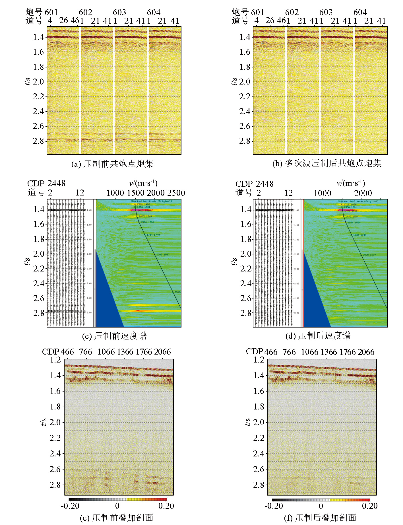 | 图9 海洋电火花震源数据SRME多次波压制前、后效果对比 |