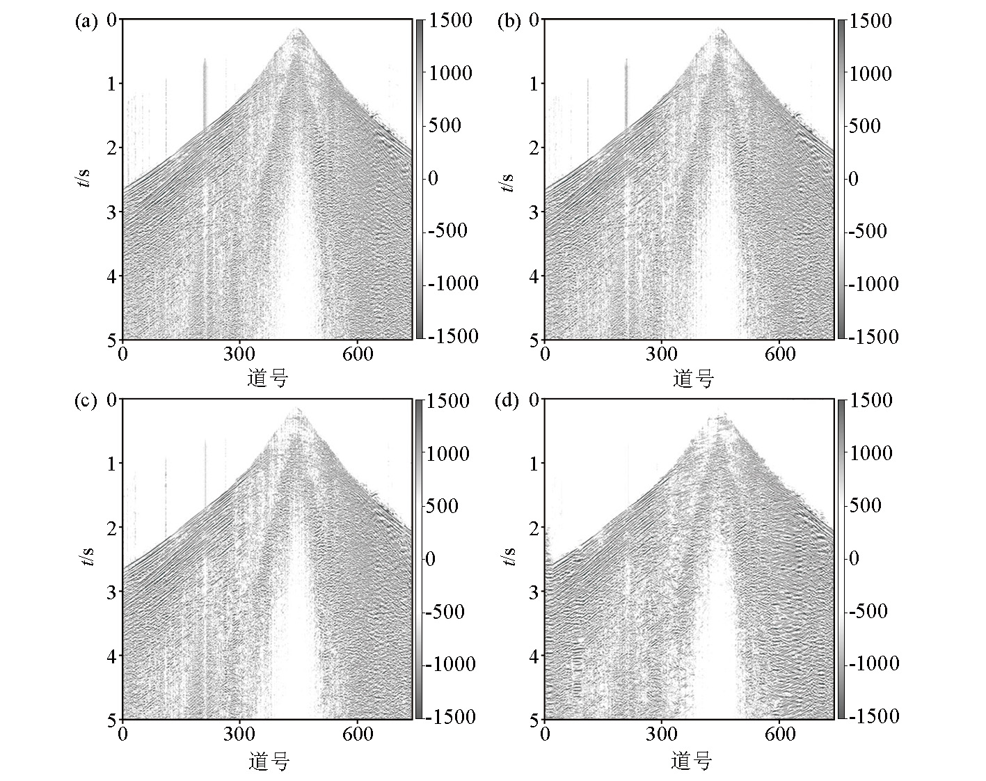 | 图11 重建单炮 a—随机缺失20%重建地震记录 (SNR=11.5 dB;PSNR=2.7 dB);b—随机缺失40%重建地震记录 (SNR=10.43 dB;PSNR=1.2 dB);c—随机缺失60%重建地震记录 (SNR=8.93 dB;PSNR=0.89 dB);d—随机缺失80%重建地震记录 (SNR=8.36 dB;PSNR=0.78 dB) |