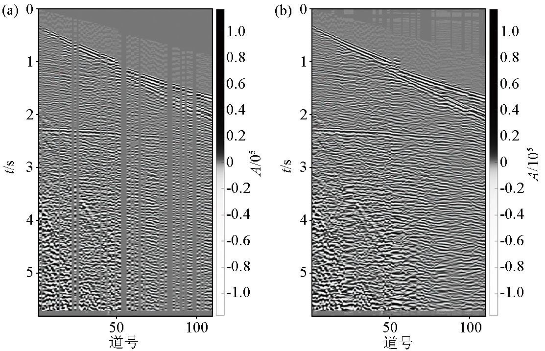 | 图13 原始炮记录重建前后对比 a—原始单炮(SNR=5.39 dB;PSNR=0.2 dB);b—重建单炮(SNR=7.53 dB;PSNR=1.6 dB) |