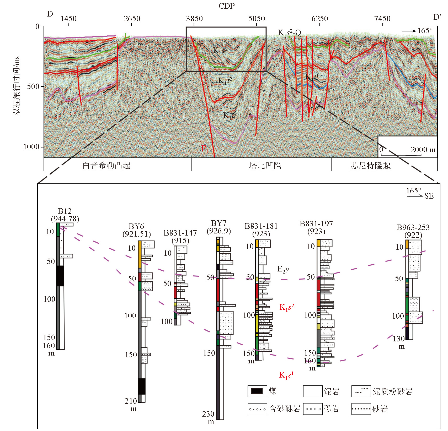 | 图6 塔北凹陷西部芒来地区D-D'剖面及对应的连井剖面 (地震反射剖面据彭云彪等[ |