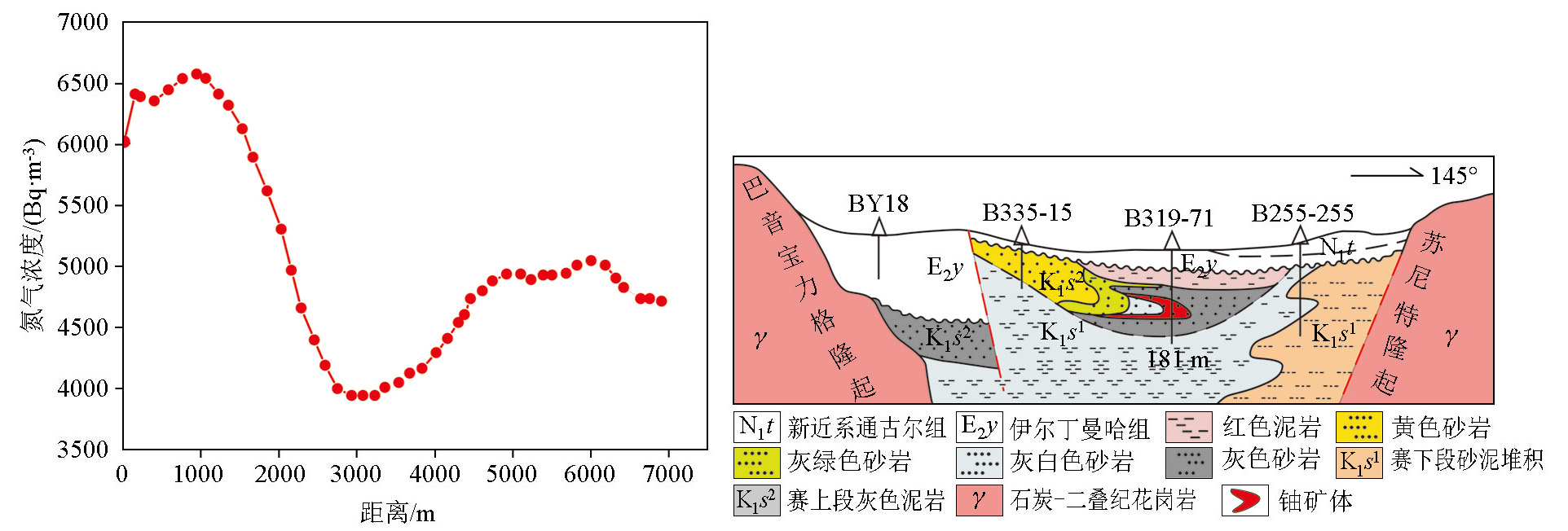 | 图8 巴彦乌拉地区土壤氡气浓度剖面(a)及典型地质剖面(b) (据吴曲波等[ |