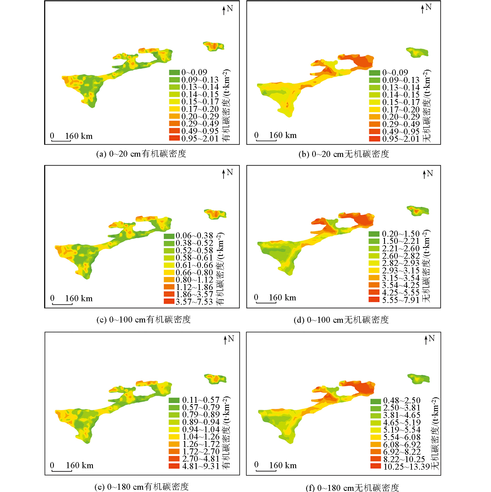 | 图5 研究区不同深度土壤有机碳、无机碳密度空间分布 a、c、e—分别为表层、中上层和全层土壤有机碳密度分布;b、d、f—分别为表层、中上层和全层无机碳密度分布 |