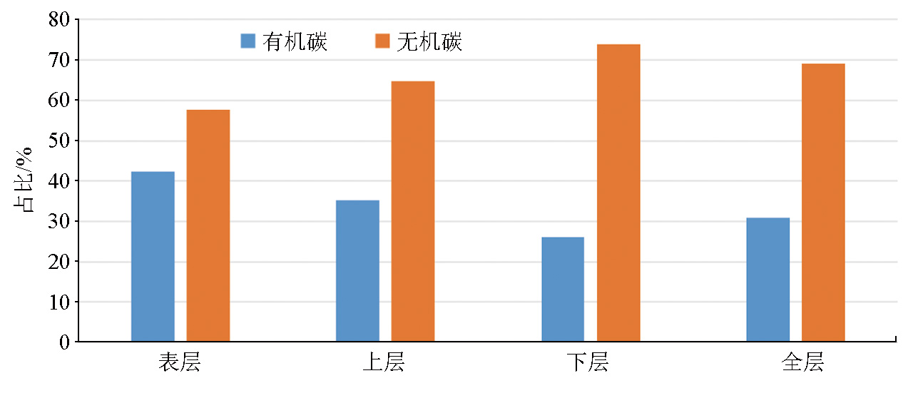 | 图2 研究区土壤各层中有机碳和无机碳储量占比 |