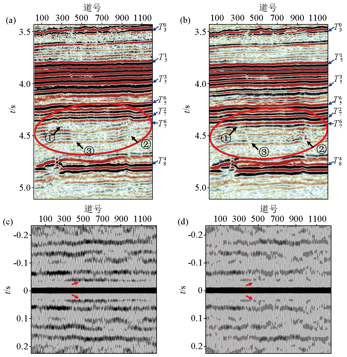 | 图10 本文方法压制层间多次波前后叠前偏移成像及其自相关分析剖面对比 a—层间多次波压制前;b—层间多次波压制后;c—层间多次波压制前自相关剖面;d—层间多次波压制后自相关剖面 |