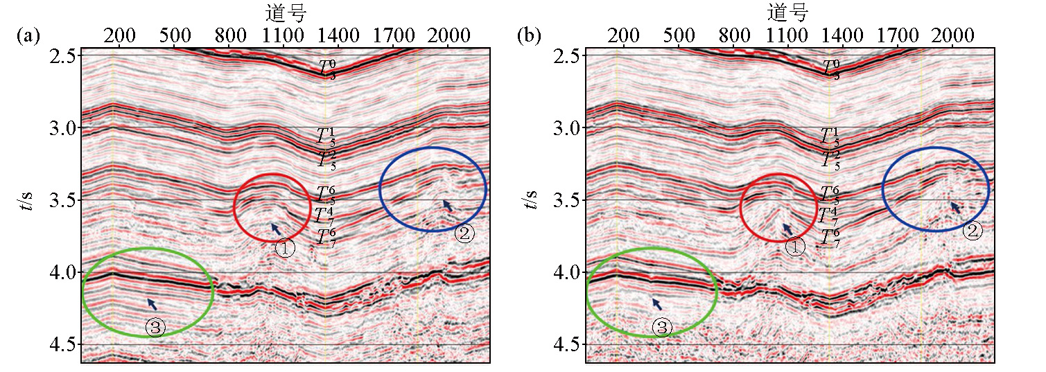 | 图11 本文方法压制层间多次波前(a)后(b)偏移剖面对比 |
