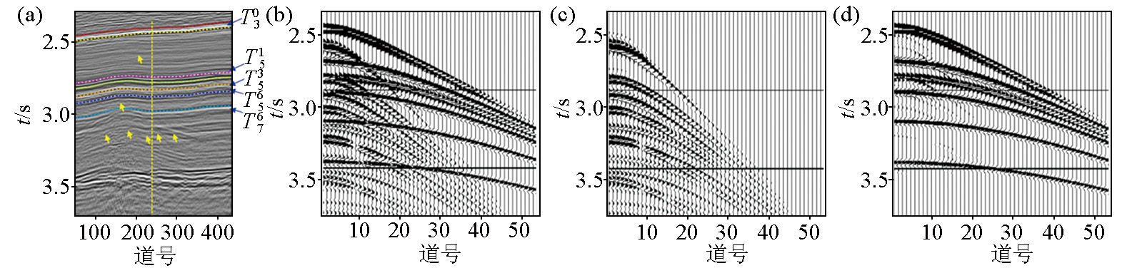 | 图7 模型法自适应相减压制多次波效果分析 a—叠加剖面;b—多次波压制前;c— |