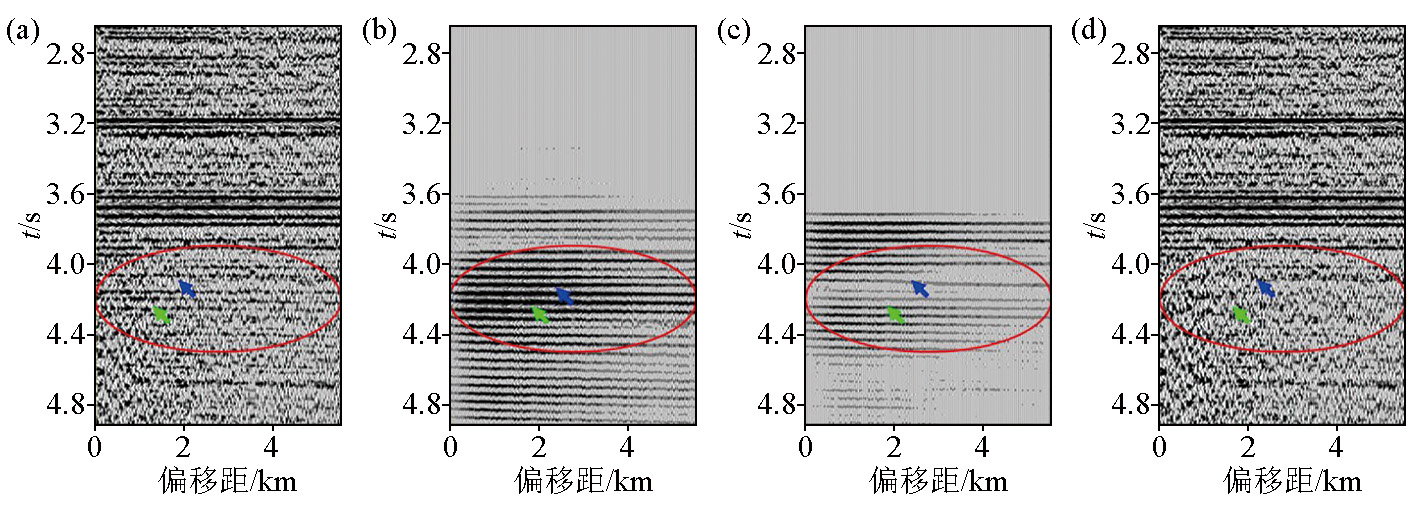 | 图8 自适应相减多次波前后CMP道集及逐层预测的多次波模型CMP道集显示 a—多次波压制前;b—预测 |