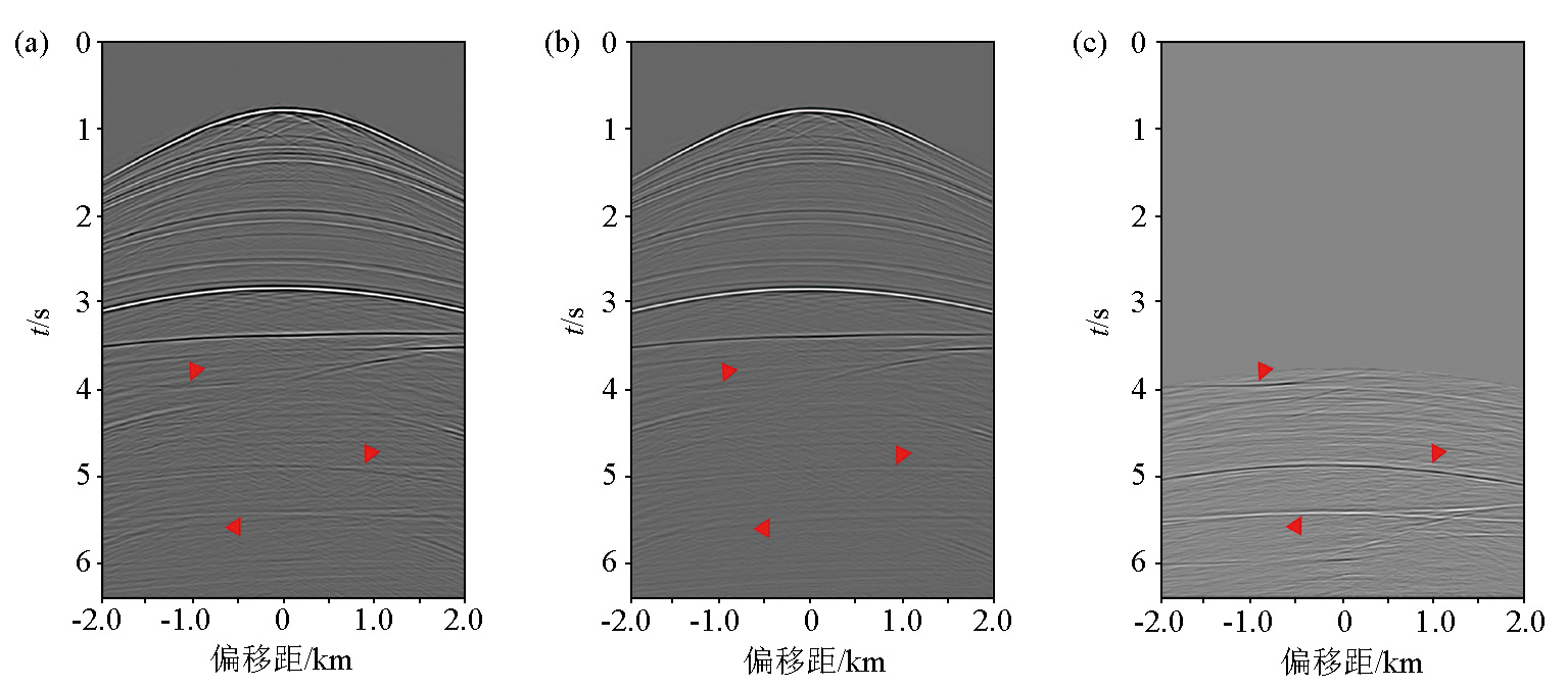 | 图7 SMAART单炮数据的层间多次波压制 a—单炮数据;b—单炮数据的层间多次波压制;c—压制的层间多次波 |