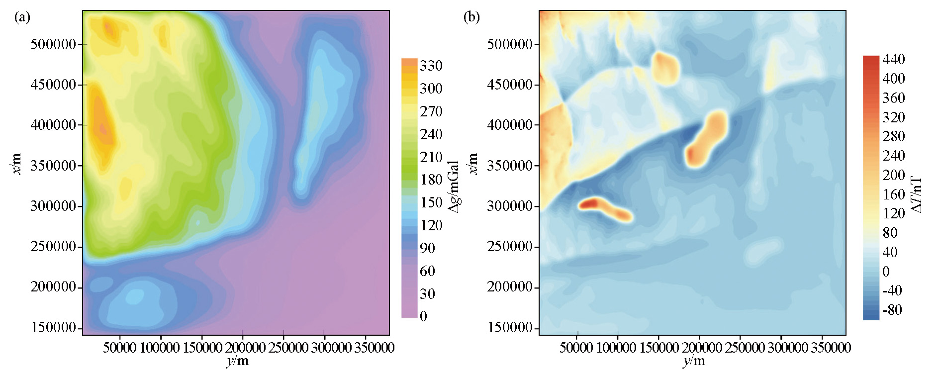 | 图10 Bishop基底模型重力场(a)和磁异常场(b)正演结果 |