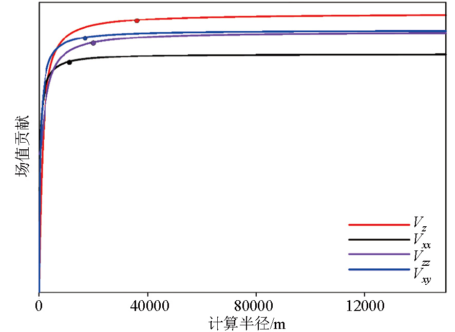 | 图3 场值贡献随计算半径变化曲线 (圆点表示计算的footprint半径坐标点) |