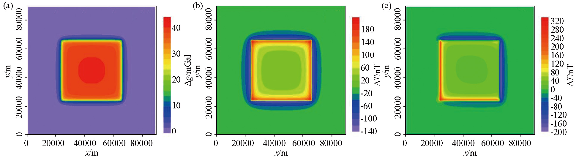 | 图6 长方体异常正演结果 a—重力场;b—垂直磁化下磁异常场;c—斜磁化下磁异常场 |