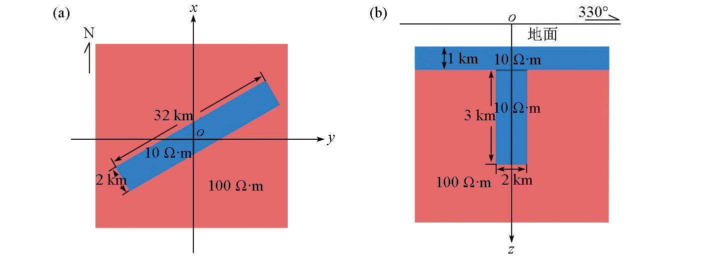 | 图12 沿北偏东60°方向延伸的直立断层模型示意 a—x-y平面示意;b—垂直于断层走向的的剖面示意 |