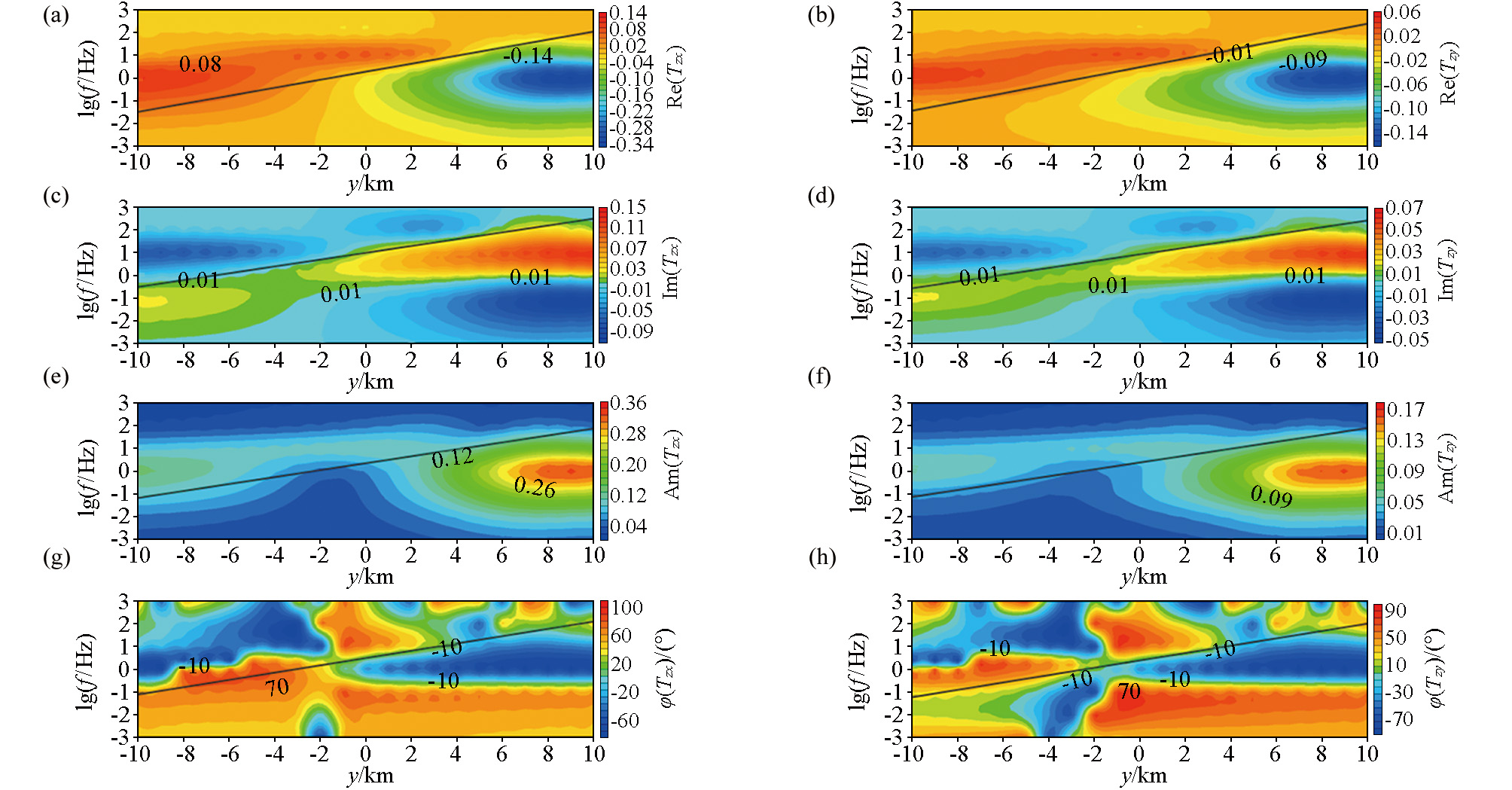 | Fig.16 Pseudo-section diagram of a normal fault dip extending in the direction of north-northeast at 60° a—Tzx tipper real part pseudo-section diagram;b—Tzy tipper real part pseudo-section diagram;c—Tzx tipper imaginary part pseudo-section diagram;d—Tzy tipper imaginary part pseudo-section diagram;e—pseudo-section diagram of the amplitude of the Tzx tipper;f—pseudo-section diagram of the amplitude of the Tzy tipper;g—pseudo-section diagram of the phase of the Tzx tipper;h—pseudo-section diagram of the phase of the Tzy tipper |