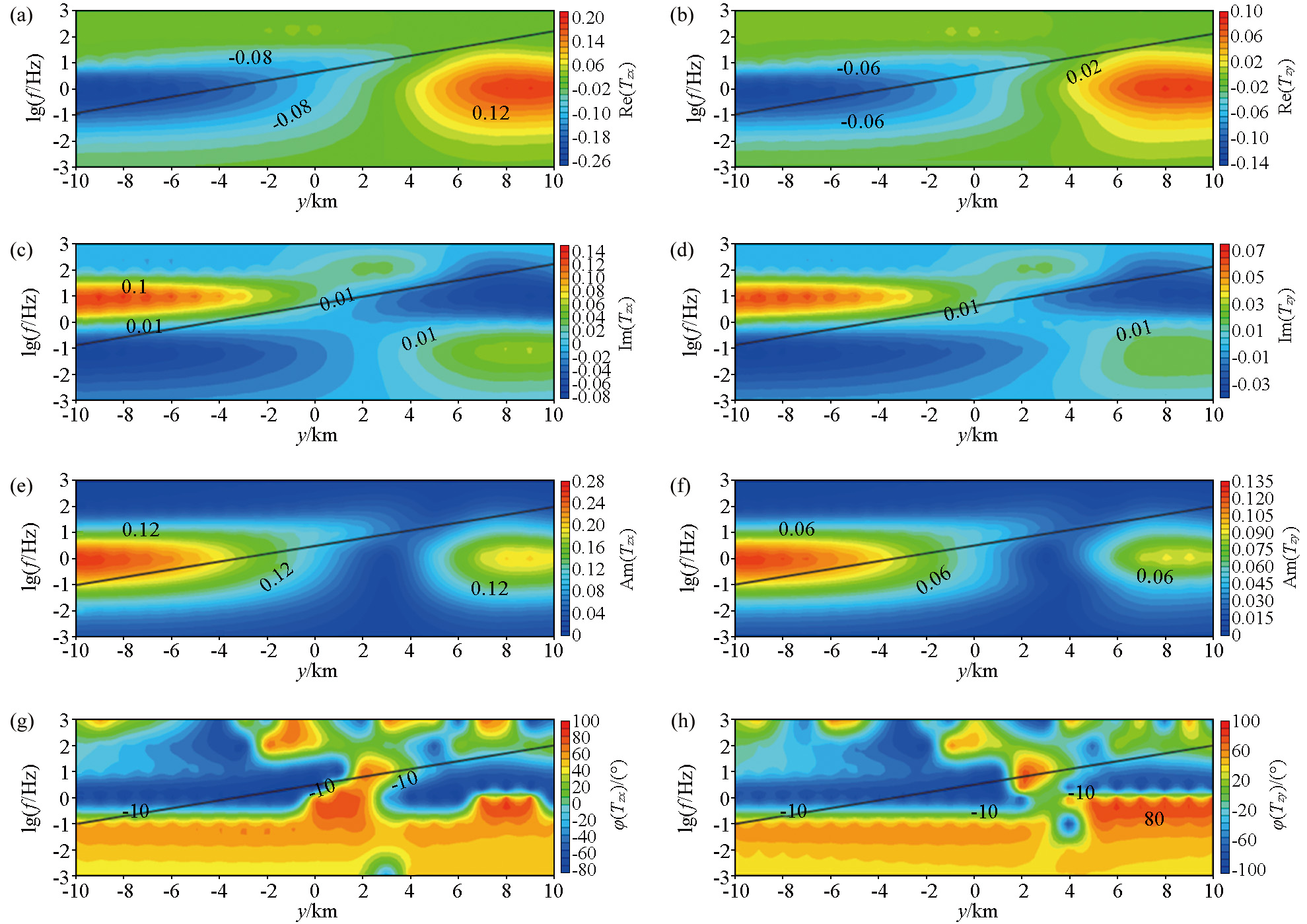 | 图19 沿北偏东60°方向延伸的逆断层倾子拟断面 a—Tzx倾子实部拟断面;b—Tzy倾子实部拟断面;c—Tzx倾子虚部拟断面;d—Tzy倾子虚部拟断面;e—Tzx倾子振幅拟断面;f—Tzy倾子振幅拟断面;g—Tzx倾子相位拟断面;h—Tzy倾子相位拟断面 |