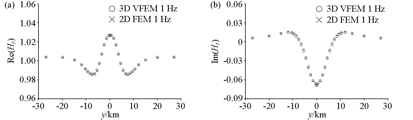 | 图5 二维棱柱体模型水平磁场分量的二维有限元数值解和三维矢量有限元数值解的对比(1 Hz) a—Hy分量的实部曲线;b—Hy分量的虚部曲线 |