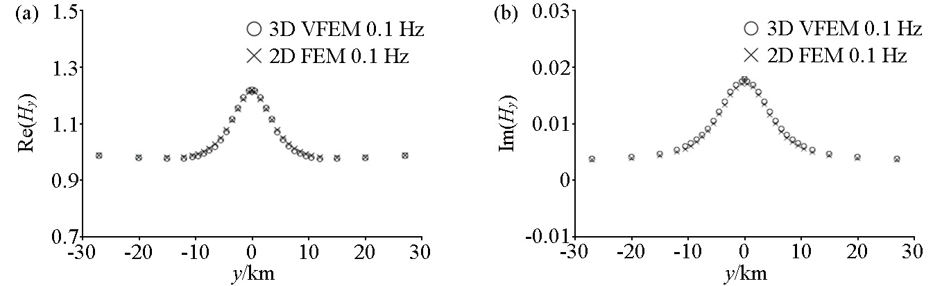 | 图8 二维棱柱体模型水平磁场分量的二维有限元数值解和三维矢量有限元数值解的对比(0.1 Hz) a—Hy分量的实部曲线;b—Hy分量的虚部曲线 |