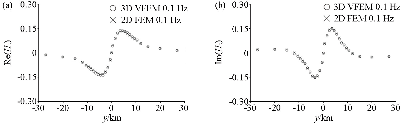 | 图9 二维棱柱体模型垂直磁场分量的二维有限元数值解和三维矢量有限元数值解的对比(0.1 Hz) a—Hz分量的实部曲线;b—Hz分量的虚部曲线 |
