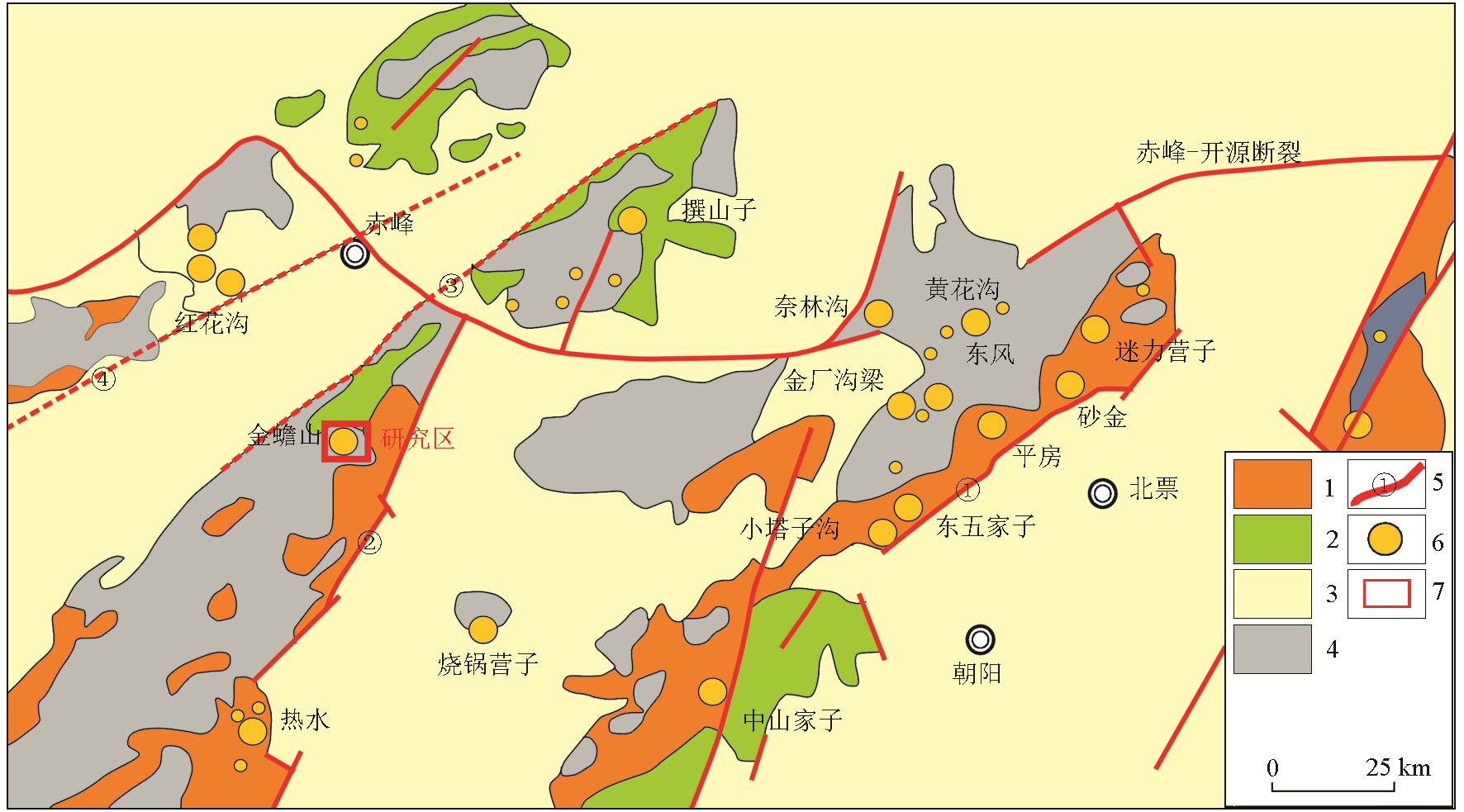 | 图1 赤峰—朝阳金矿集区构造地质简图(据彭丽娜[ 1—太古宙变质岩; 2—古生界地层; 3—中-新生界地层; 4—中生代花岗岩; 5—区域断裂(①—承德-北票断裂;②—红山-八里罕断裂;③—锦山—美林断裂;④—红花沟断裂);6—金矿床;7—研究区 |