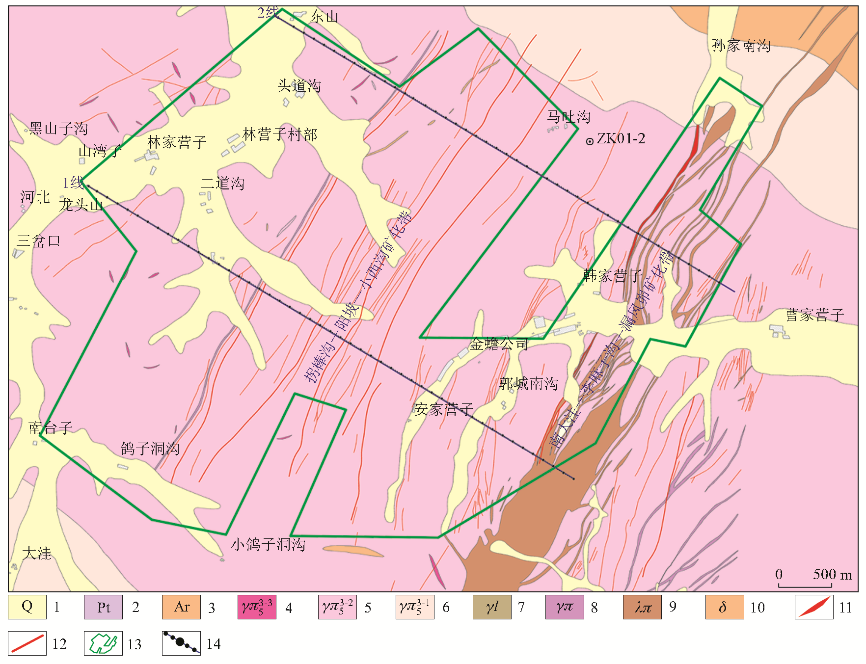 | 图2 金蟾山金矿区地质与化探剖面位置 1—第四系冲洪积砂、砾石层;2—元古宇明安山群千枚状二长云英片岩、石英片岩夹大理岩;3—太古宇伙家沟群黑云斜长片(麻)岩夹角闪斜长片岩、大理岩;4—晚燕山期第三次侵入石英斑岩、花岗斑岩、流纹斑岩;5—晚燕山期第二次侵入似斑状二长花岗岩;6—晚燕山期第一次侵入似斑状二长花岗岩;7—流纹斑岩;8—花岗斑岩;9—石英斑岩;10—闪长岩;11—主矿化蚀变带;12—次级矿化蚀变带;13—金矿区范围;14—化探采样点 |