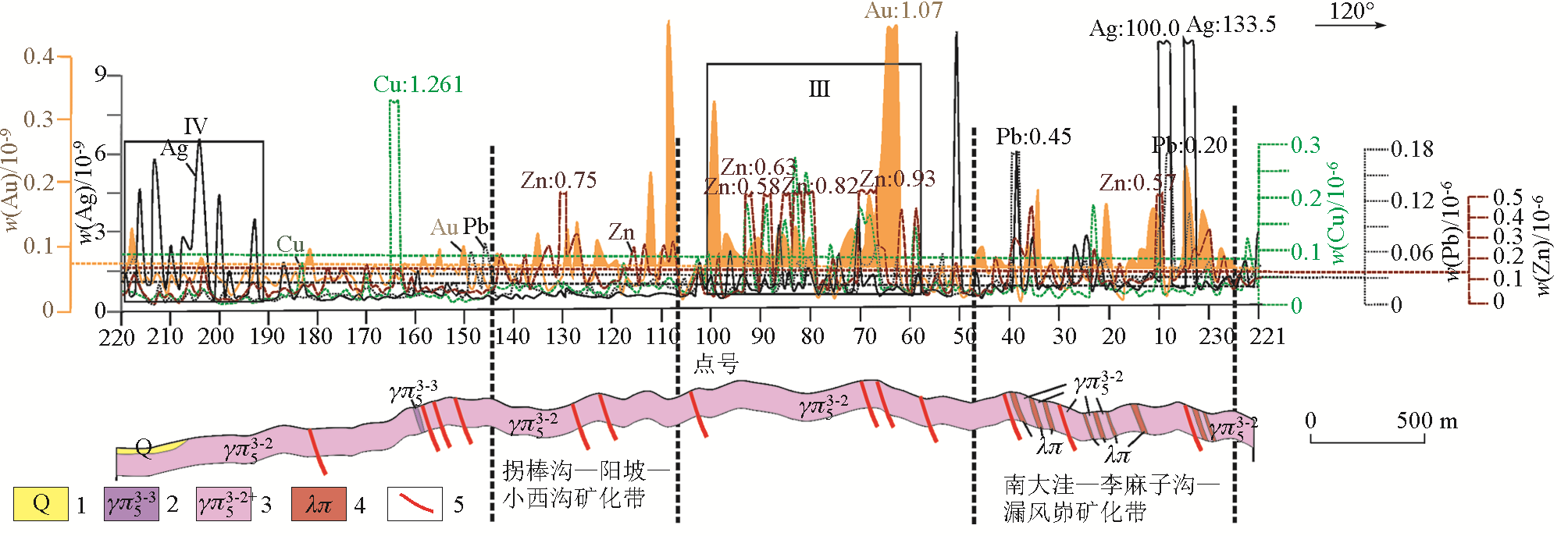 | Fig.4 Soil geochemical profile of line 2 in the Chifeng Jinchanshan mining area 1—Quaternary alluvial and proluvial sand and gravel layers; 2—late Yanshanian third intrusion of porphyritic quartz porphyry, granite porphyry, and rhyolite porphyry;3—late Yanshanian second intrusion of porphyritic monzonitic granite; 4—quartz porphyry; 5—secondary mineralized alteration zone |