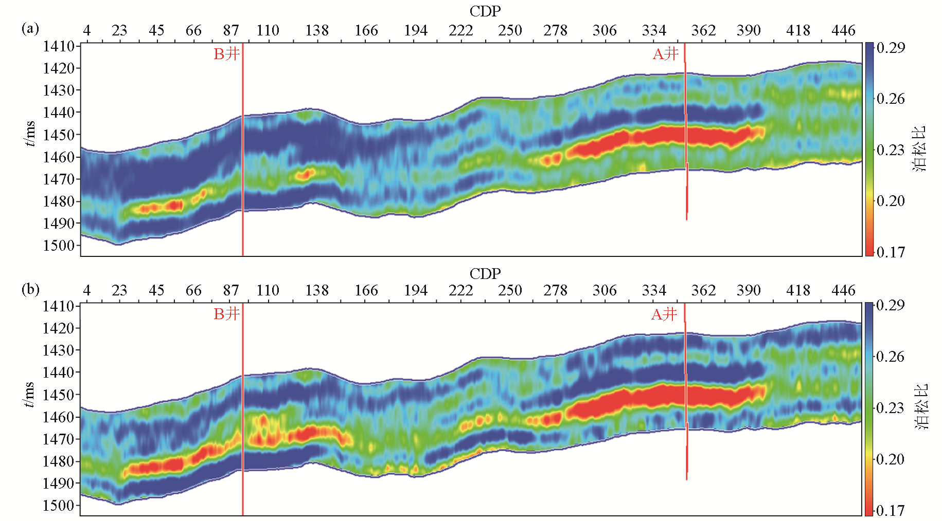 | 图12 使用A井(a)和同时使用A、B井(b)得到的泊松比反演对比 |