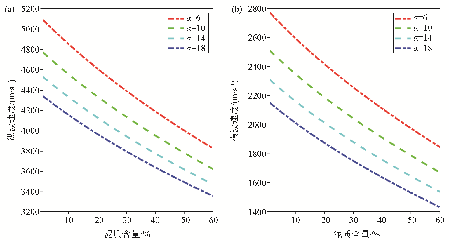 | 图3 纵波速度(a)和横波速度(b)随泥质含量和固结参数α的变化 |